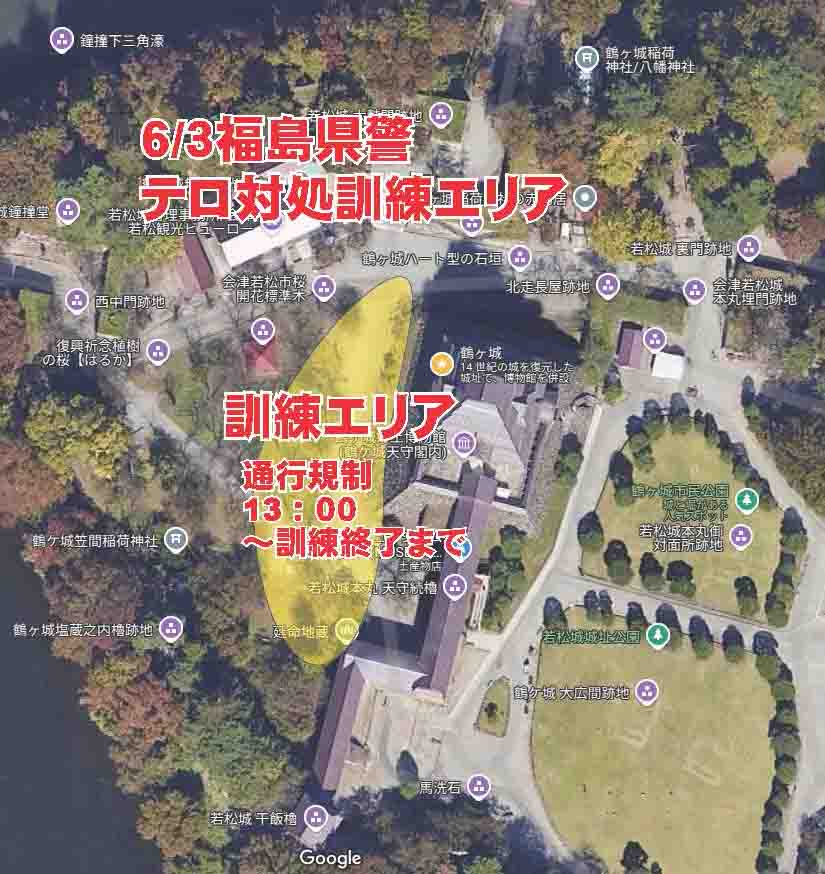 6/3福島県警「テロ対処訓練」の実施について 2025年5月31日 令和7年6月3日(火)に福島県警察の「テロ対処訓練」が鶴ヶ城公園にて実施されます。訓練実施に伴い、園内一部に通行規制を行います。(天守閣西側エリア:鉄門~管理事務所付近)下記の画像を参照ください。ご理解ご協力をお願いいたします。 【テロ対処訓練の実施】 福島県警では、県内各地においてテロ対処訓練を実施しており、今年度の訓練は、「鶴ヶ城において、液体が撒かれ多数の負傷者が発生した」との想定のもと、警察、消防、事業所による官民連携の訓練を実施し、関係機関との連携や事案対処能力の更なる向上を図るものです。 pic.twitter.com/1vYobyIkHD— 福島県警察安全・安心情報 (@FP_seian) May 29, 2025