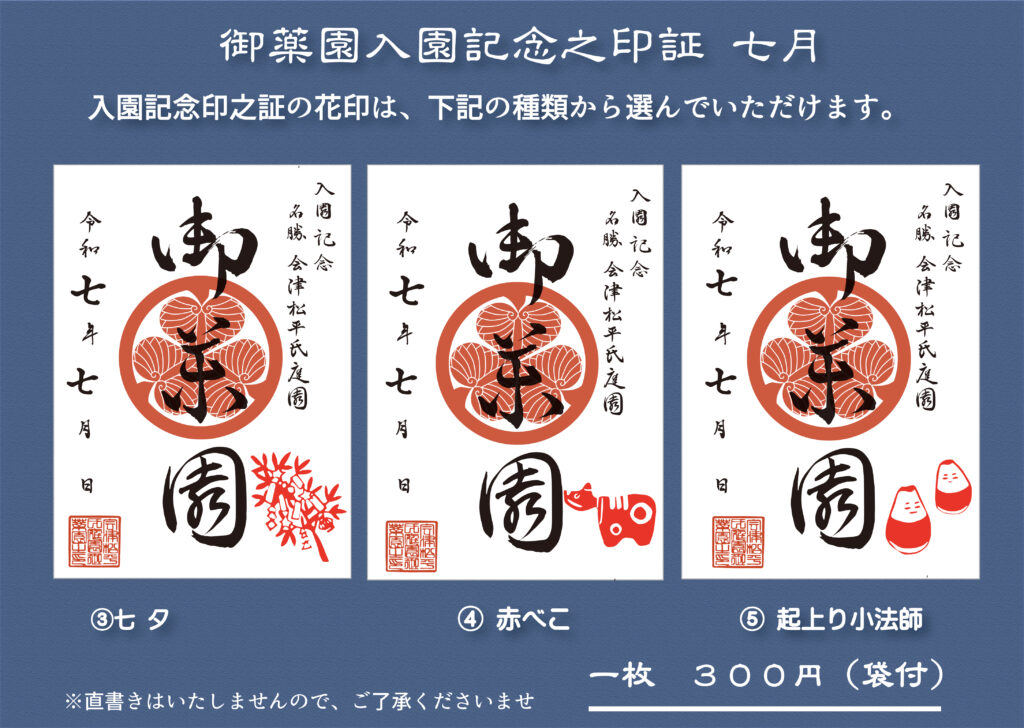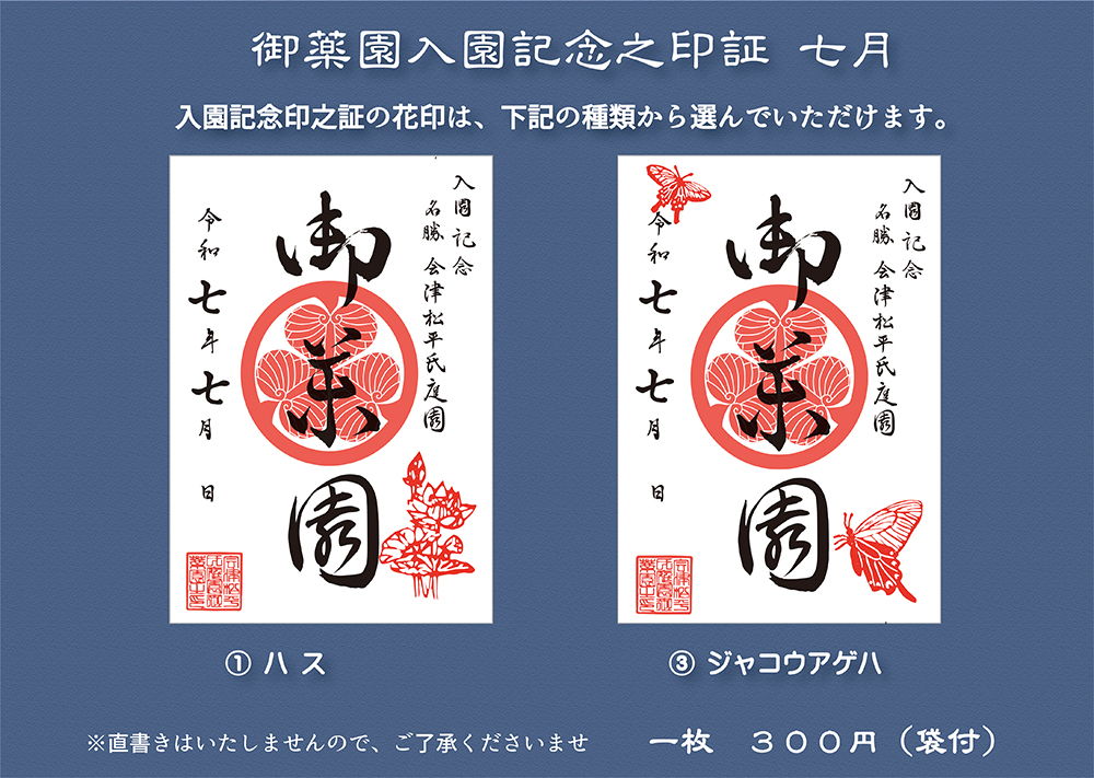会津松平氏庭園 御薬園 七月入園記念印証 2025年6月28日 七月の入園記念印証の花印は、『蓮』です。七月初旬から八月中旬ころまで、薬草園内の蓮池でご覧いただけます。ハスの花言葉は「清らかな心」「休養」「神聖」「雄弁」「沈着」だそうです。 そのほか、会津伝統縁起物の❝ 赤べこ ❞ や ❝ 起き上がり小法師 ❞、園内に生息するビロードのような光沢のある黒色の蝶々であるジャコウアゲハを花印としてご用意いたします。