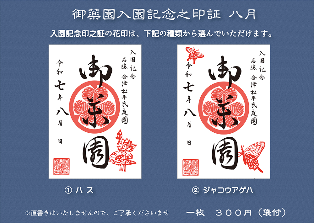 会津松平氏庭園 御薬園 八月入園記念印証 2025年7月23日 八月の入園記念印証の花印は、『蓮』です。御薬園内の蓮池には、古代蓮やオオガ蓮など数種類の蓮をご覧いただけます。本年は、生育も非常に良く八月初旬ころまでの見ごろとなります。そのほかの花印は、会津伝統縁起物の❝ 赤べこ ❞ や ❝ 起き上がり小法師 ❞、さらに、御薬園に舞う『ジャコウアゲハ』という黒色の蝶々もこの季節の風物詩として花印にてご用意いたします。詳しくは、入園券売場係員にお申し付けくださいませ。