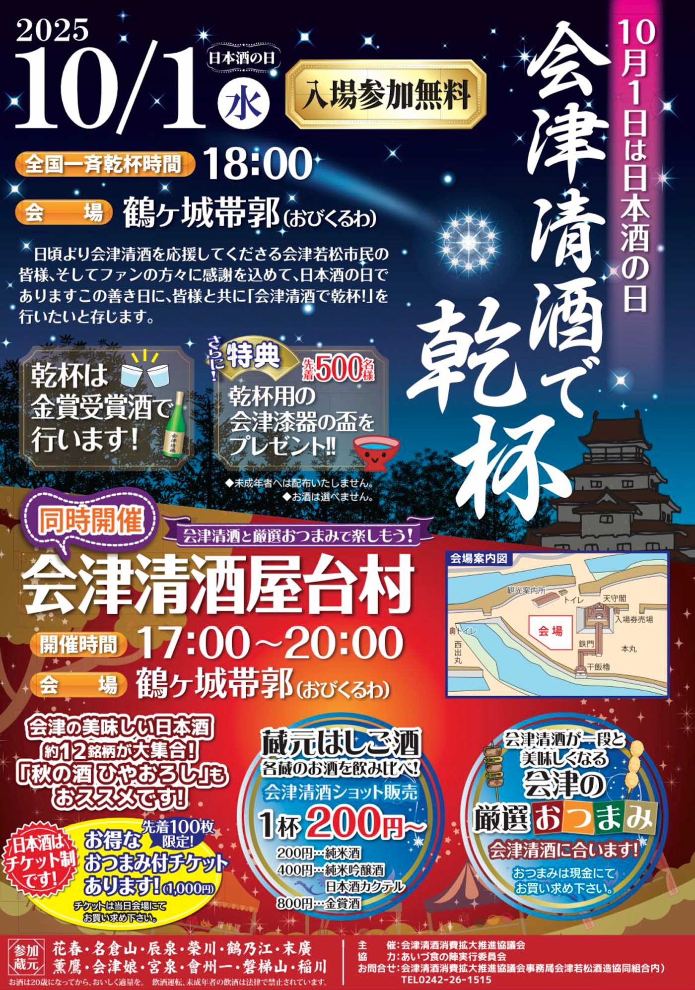 10/1(水)の「日本酒の日」に、「会津清酒で乾杯」イベントが鶴ヶ城で開催されます。