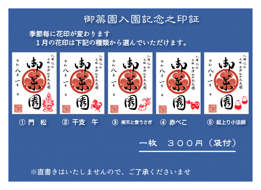 名勝会津松平氏庭園 御薬園 1月入園記念印証 2026年1月2日2025年12月30日 謹んで新年のお慶び申し上げます旧年中は格別のお引き立てを賜り誠にありがとうございました皆様のご健康とご繁栄を心からお祈り申し上げます本年も何卒よろしくお願い申し上げます