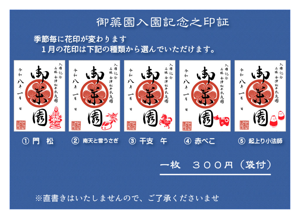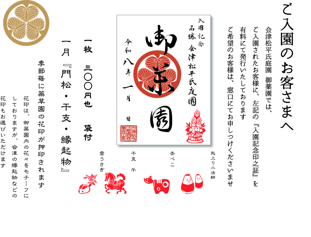 名勝会津松平氏庭園 御薬園 1月入園記念印証 2025年12月30日 謹んで新年のお慶び申し上げます旧年中は格別のお引き立てを賜り誠にありがとうございました皆様のご健康とご繁栄を心からお祈り申し上げます本年も何卒よろしくお願い申し上げます