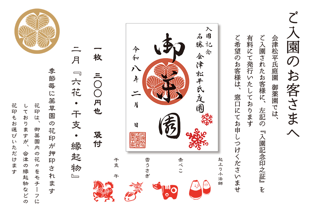 会津松平氏庭園 御薬園 二月入園記念印証 2026年2月3日2026年2月2日 2月は1年で最も日数が少ない月です。旧暦では「如月(きさらぎ)」と呼ばれ、寒さから衣をさらに重ねて着る「衣更着(きさらぎ)」が語源とされています。また「雪の異称」が名前の由来で、雪の結晶の多くが六角形をしていることから、雪を六花(りっか)と呼ぶことがあります。