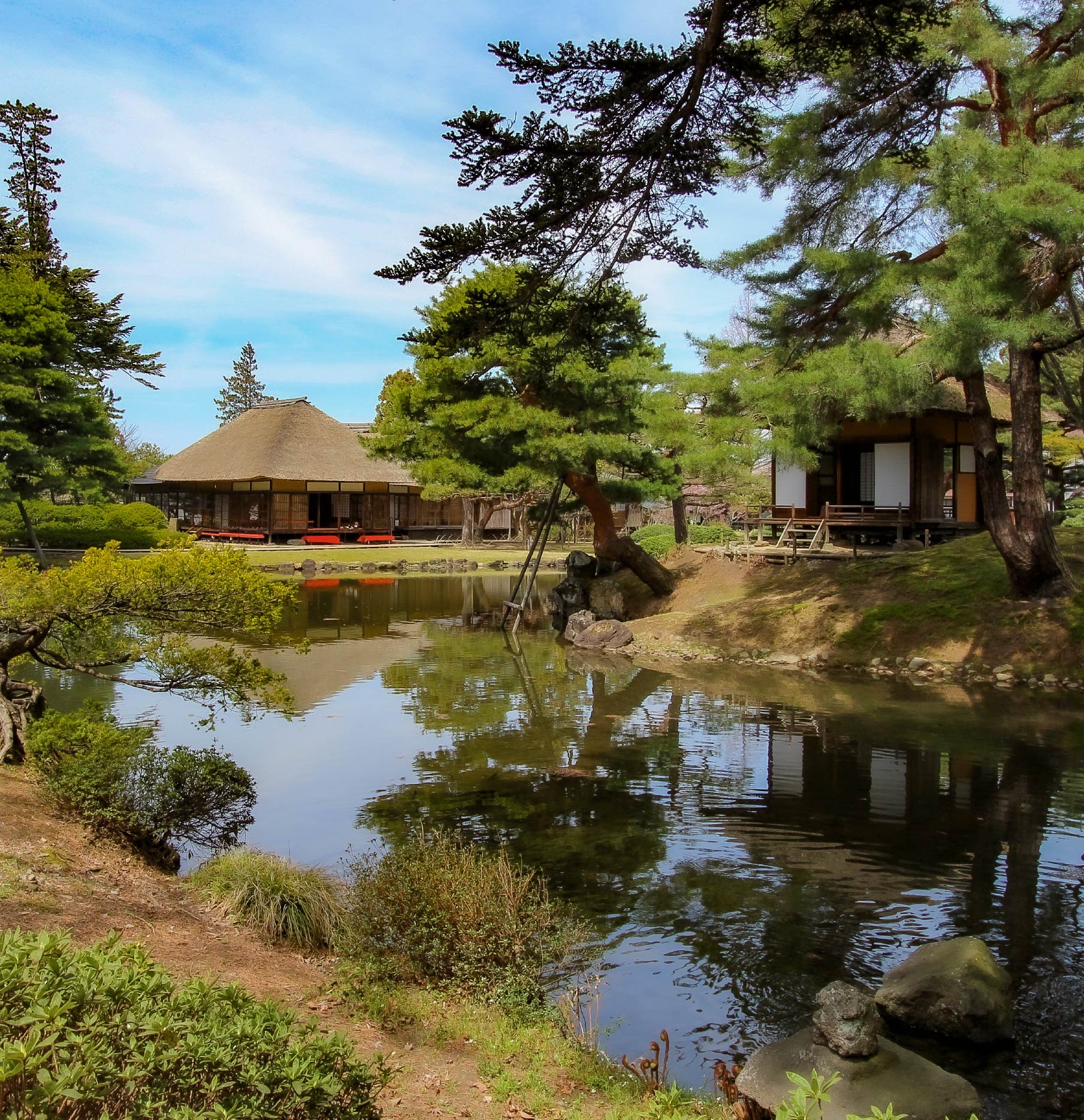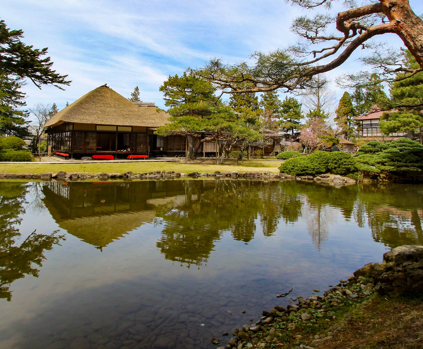 三代会津藩主 松平正容の時代、1696年(元禄9年)大名庭園造りで名高い小堀遠州の流れを汲む園匠目黒浄定と普請奉行により、鶴が清水を残しつつ、園内中央に大きな池を配し、借景という技法を取り入れた池泉式回遊庭園に大改修されました。池の水源は、猪苗代湖(戸の口堰)と東山の湯川の二系統から引き入れています。